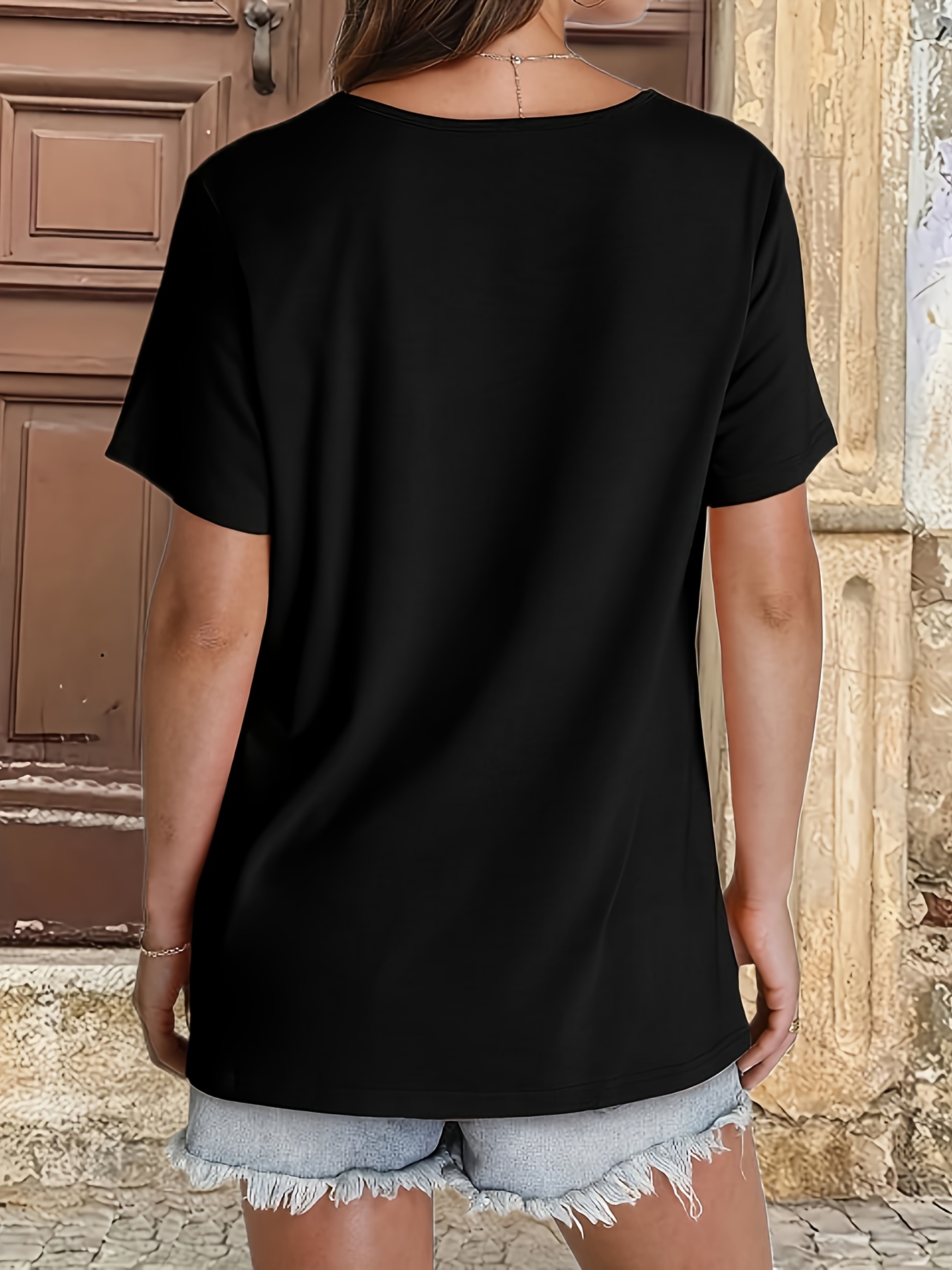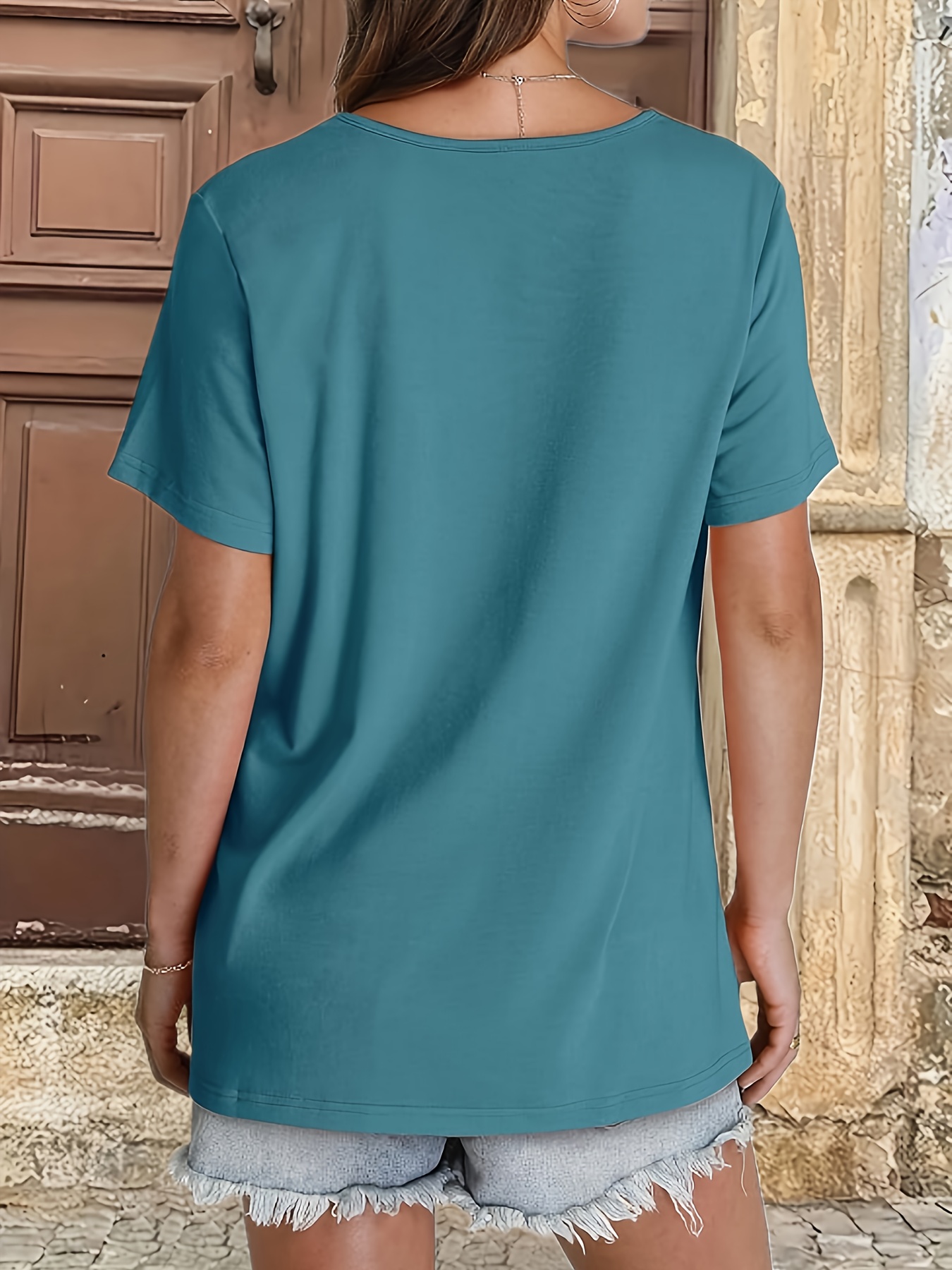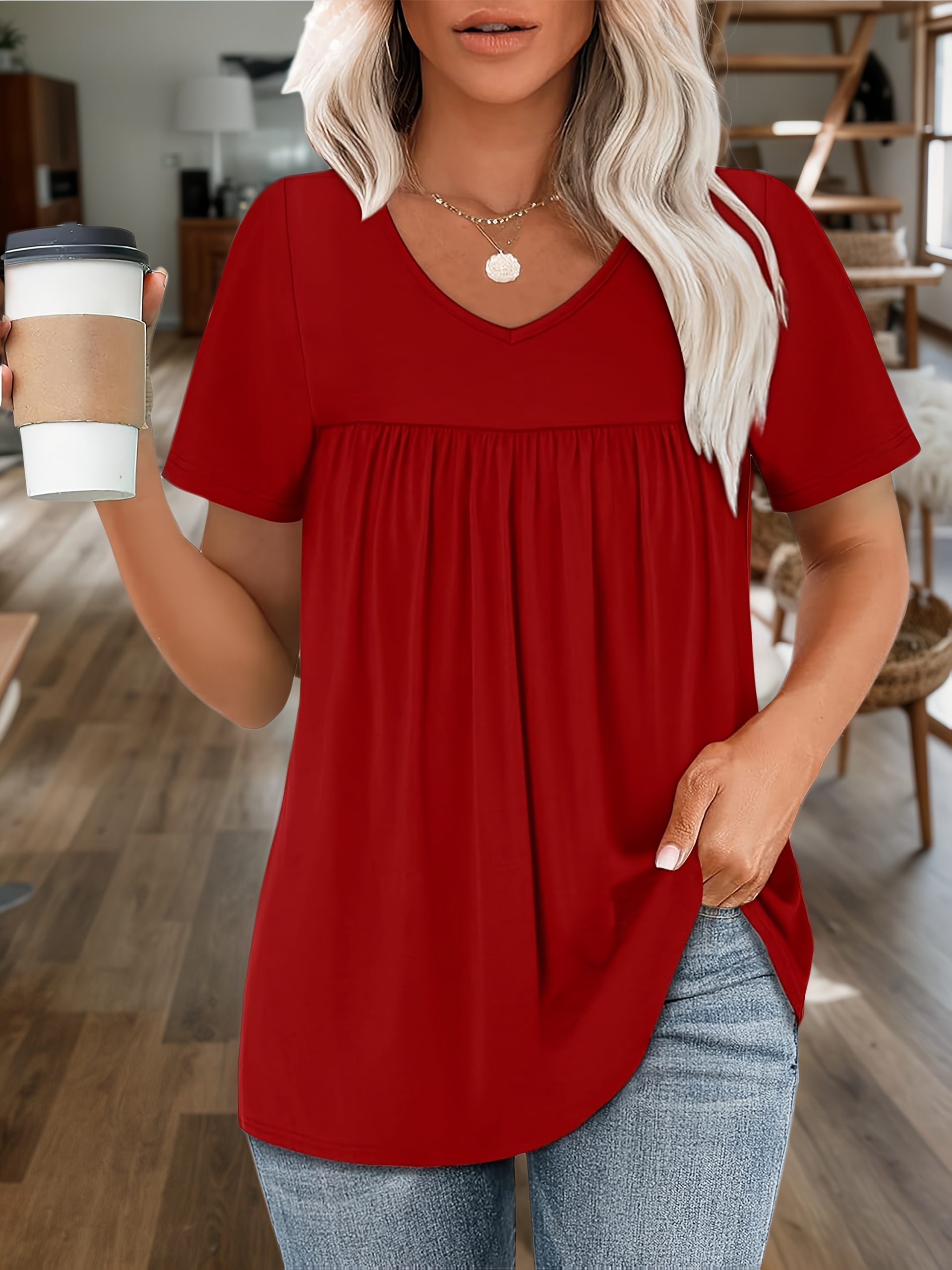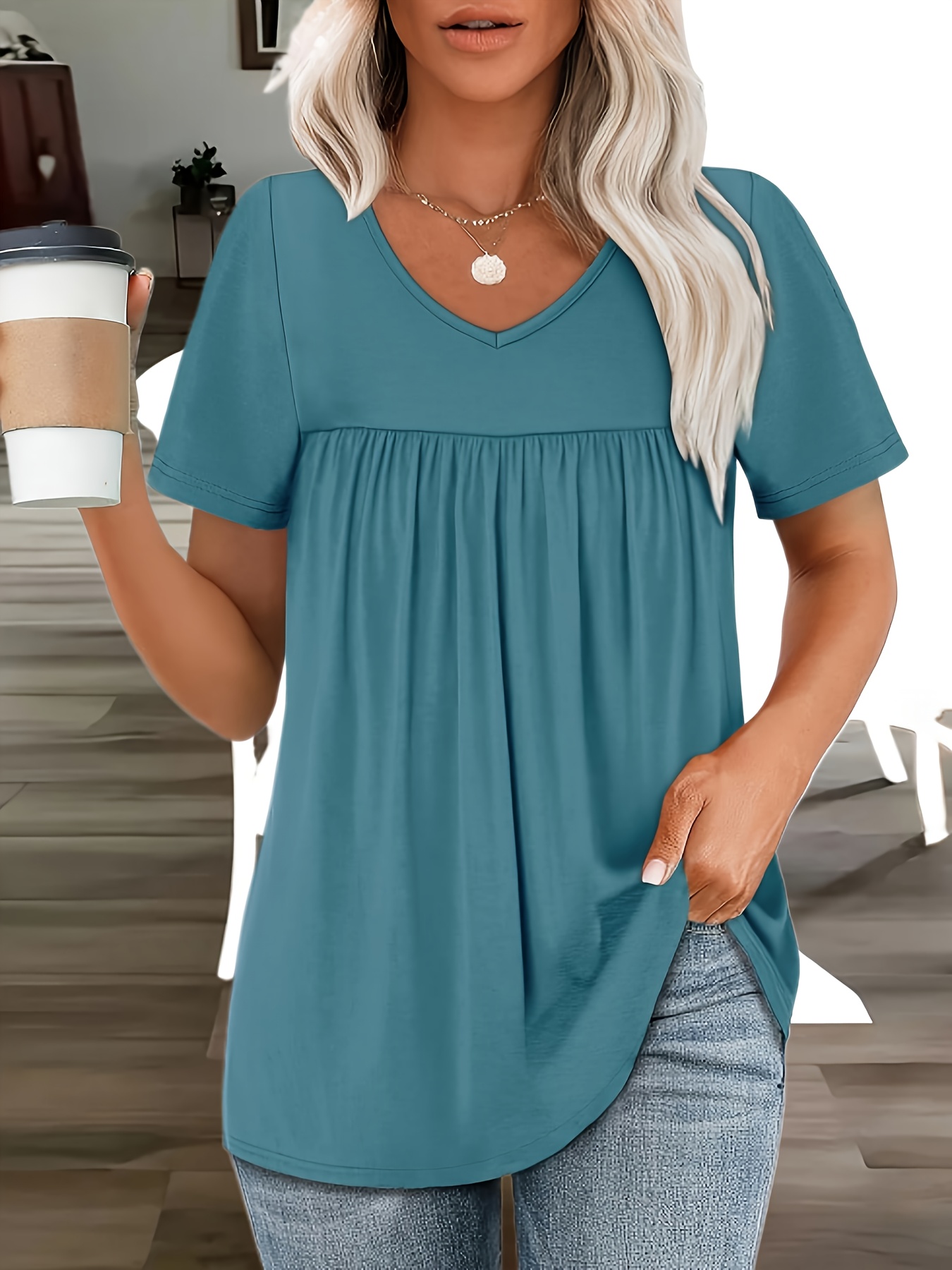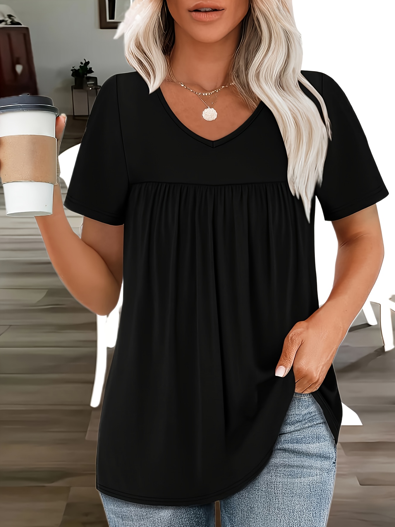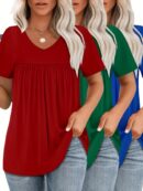 3pcs Women’S Plus Size V-Neck T-Shirts – Elegant Solid Color Short Sleeve Tops with Ruched Bust, Medium Stretch Fabric, Perfect for Springu002FSummeru002FFall